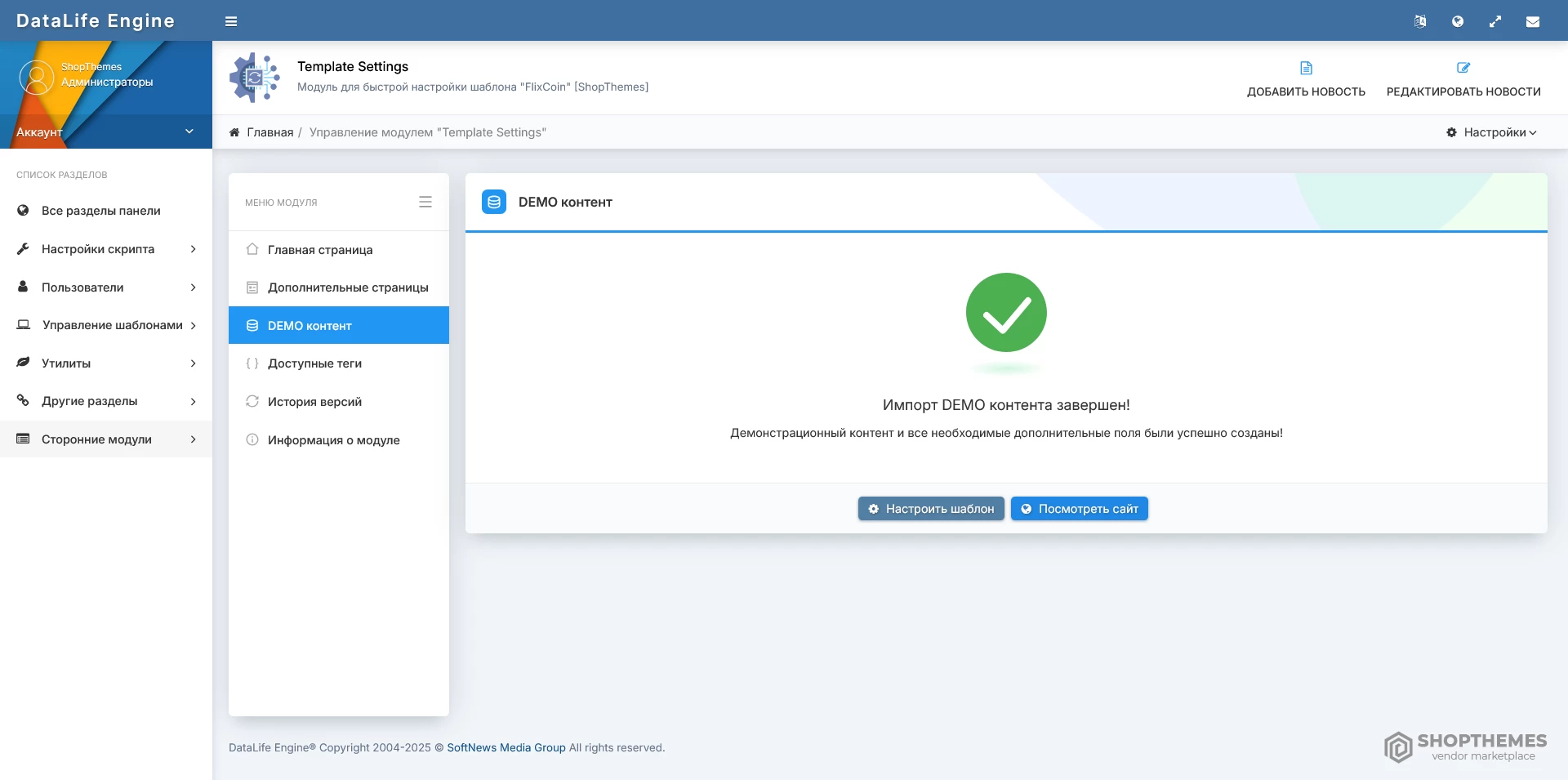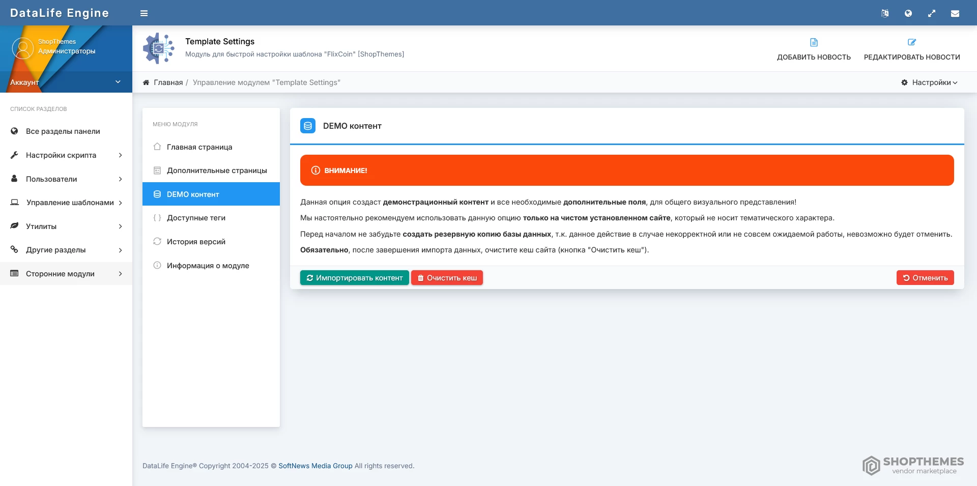 Данная опция, создаст демонстрационный контент и все необходимые дополнительные поля, для общего визуального представления! Все изображения на снимках экрана предназначены только для демонстрационных целей.