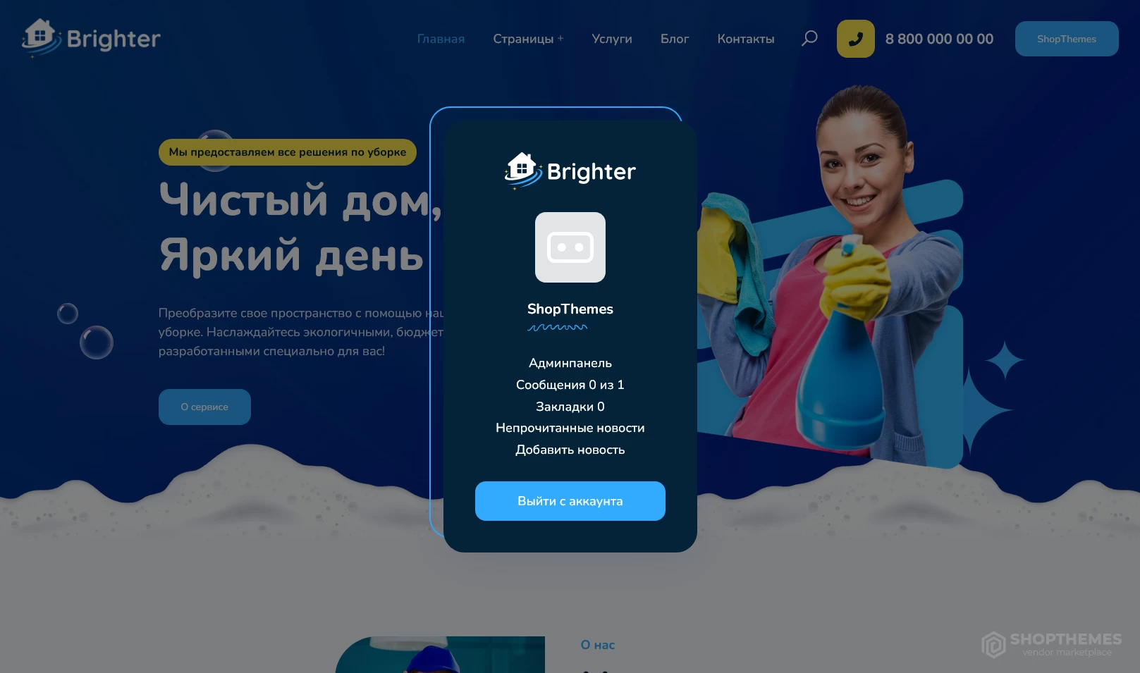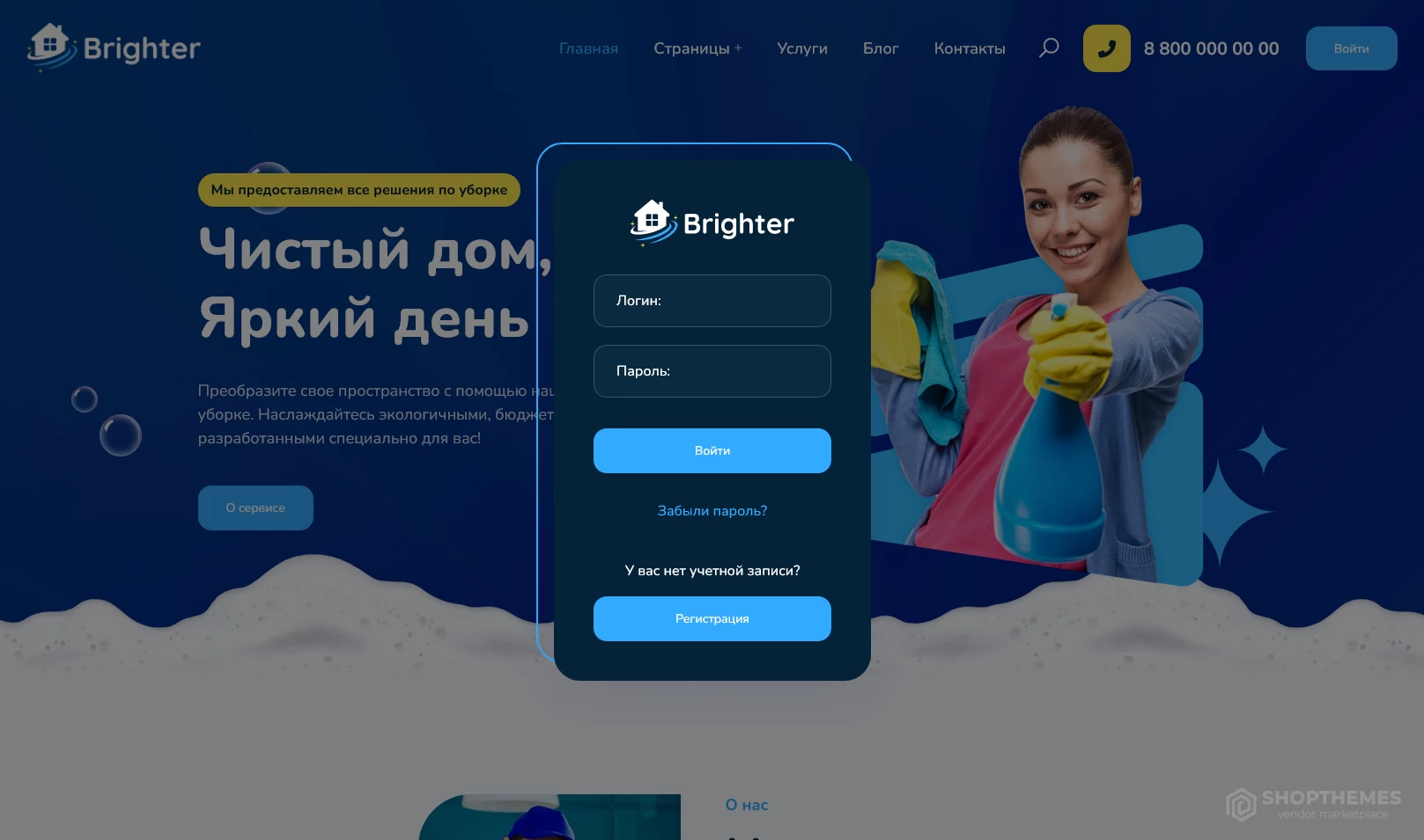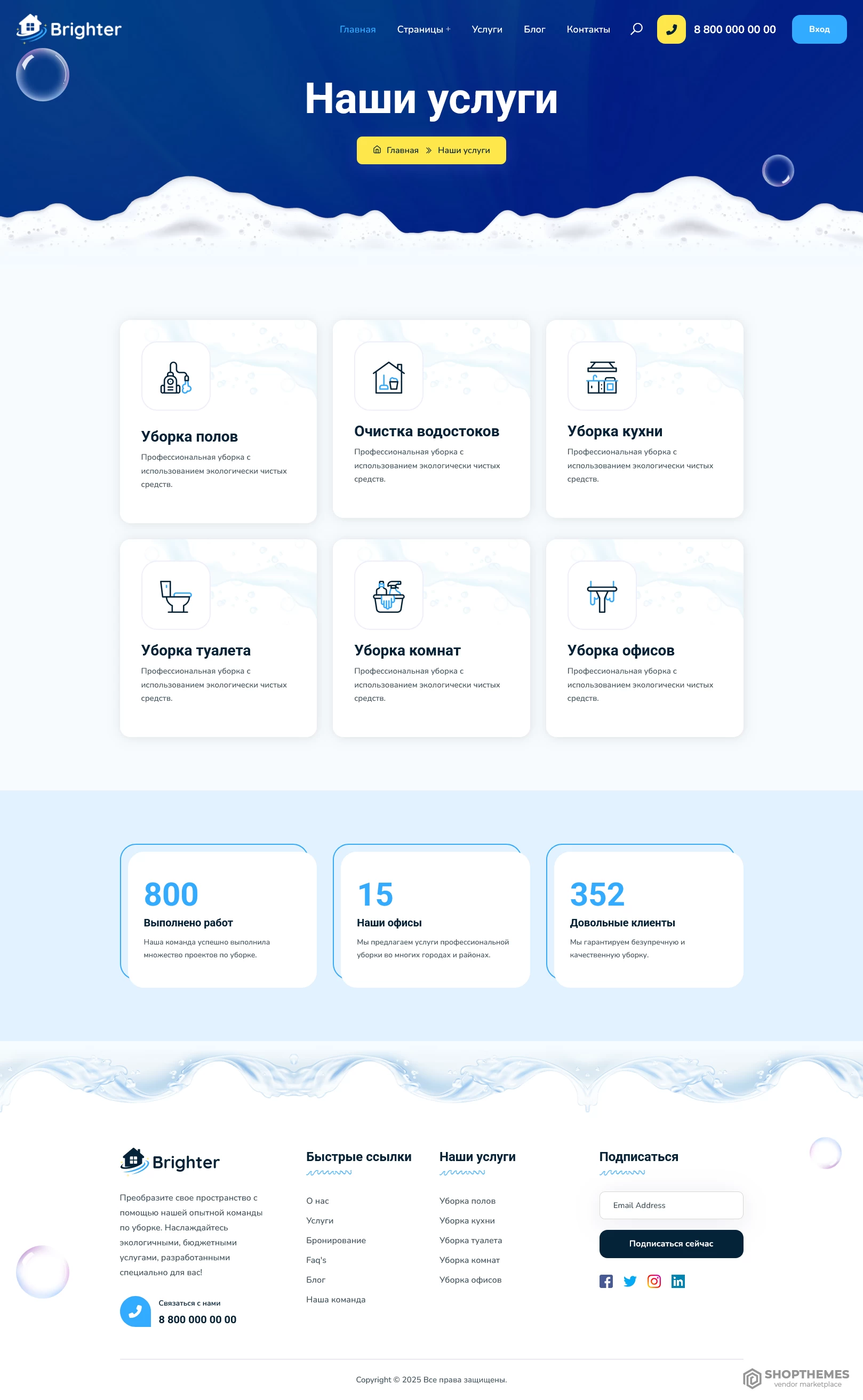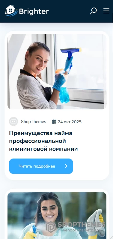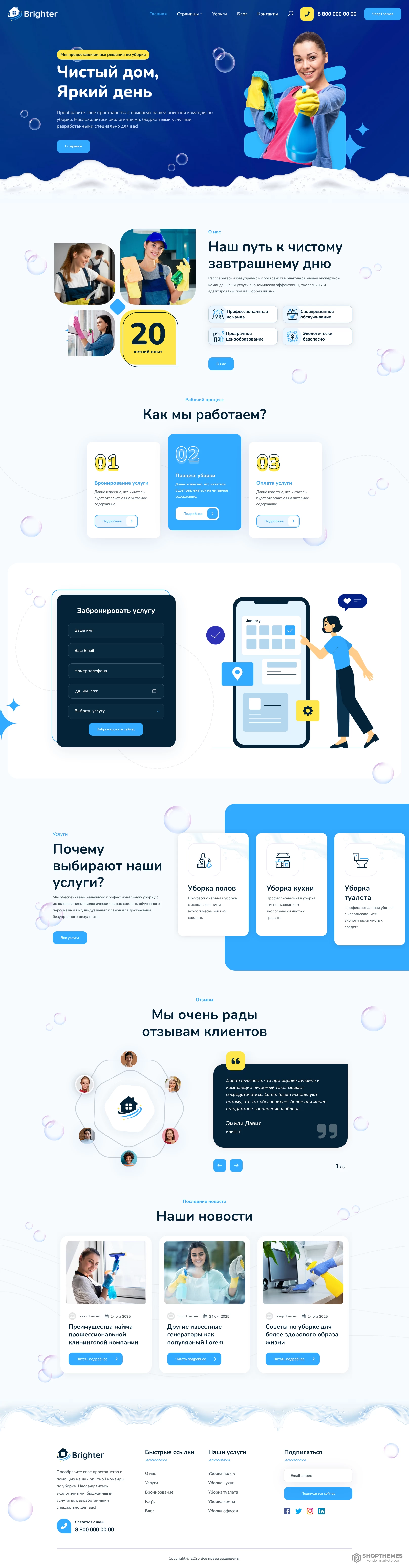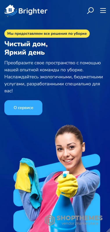 Brighter — это современный и полностью адаптивный шаблон DLE, разработанный для компаний, работающих в сфере клининга, технического обслуживания и услуг разнорабочих. Этот шаблон идеально подходит для клининговых компаний, электриков, инженеров, маляров, сантехников и поставщиков, обеспечивая простой и удобный интерфейс. Разработанный с использованием Bootstrap 5, HTML5, CSS3 и SASS, он обеспечивает высокую производительность, лаконичный дизайн и простую настройку.