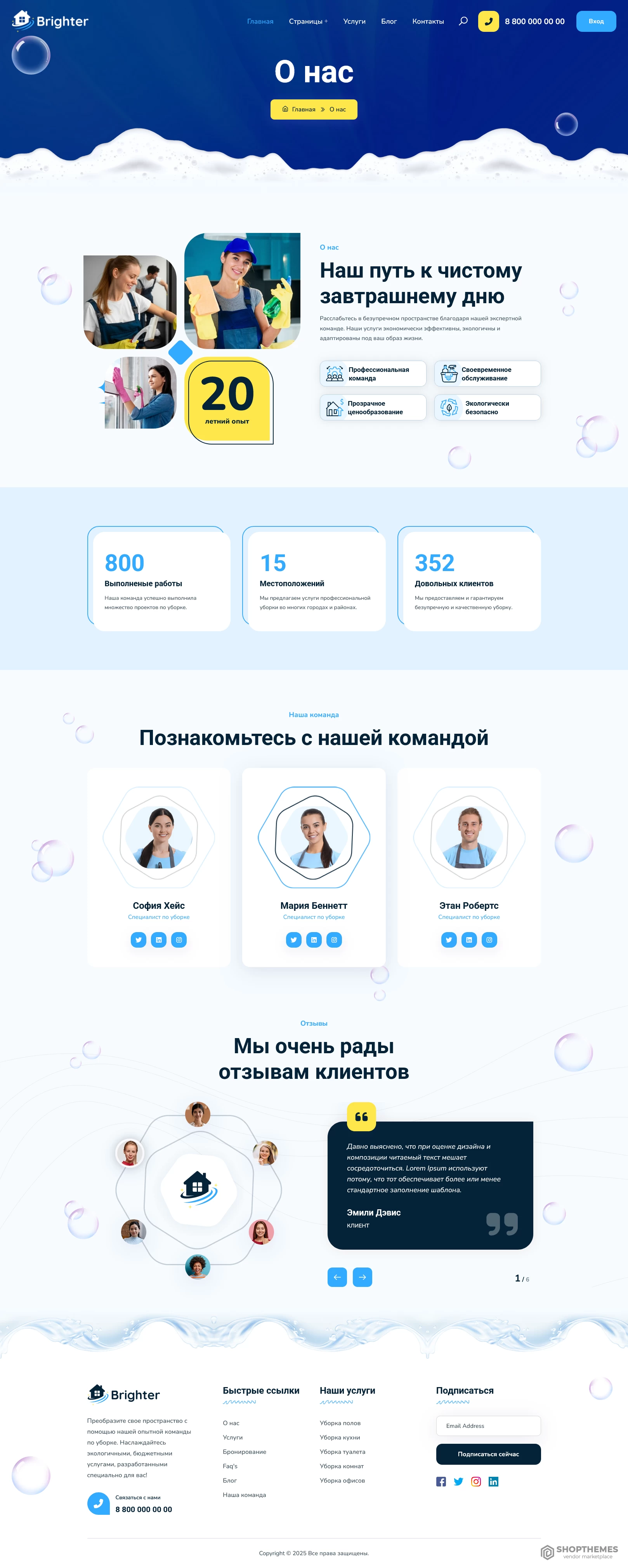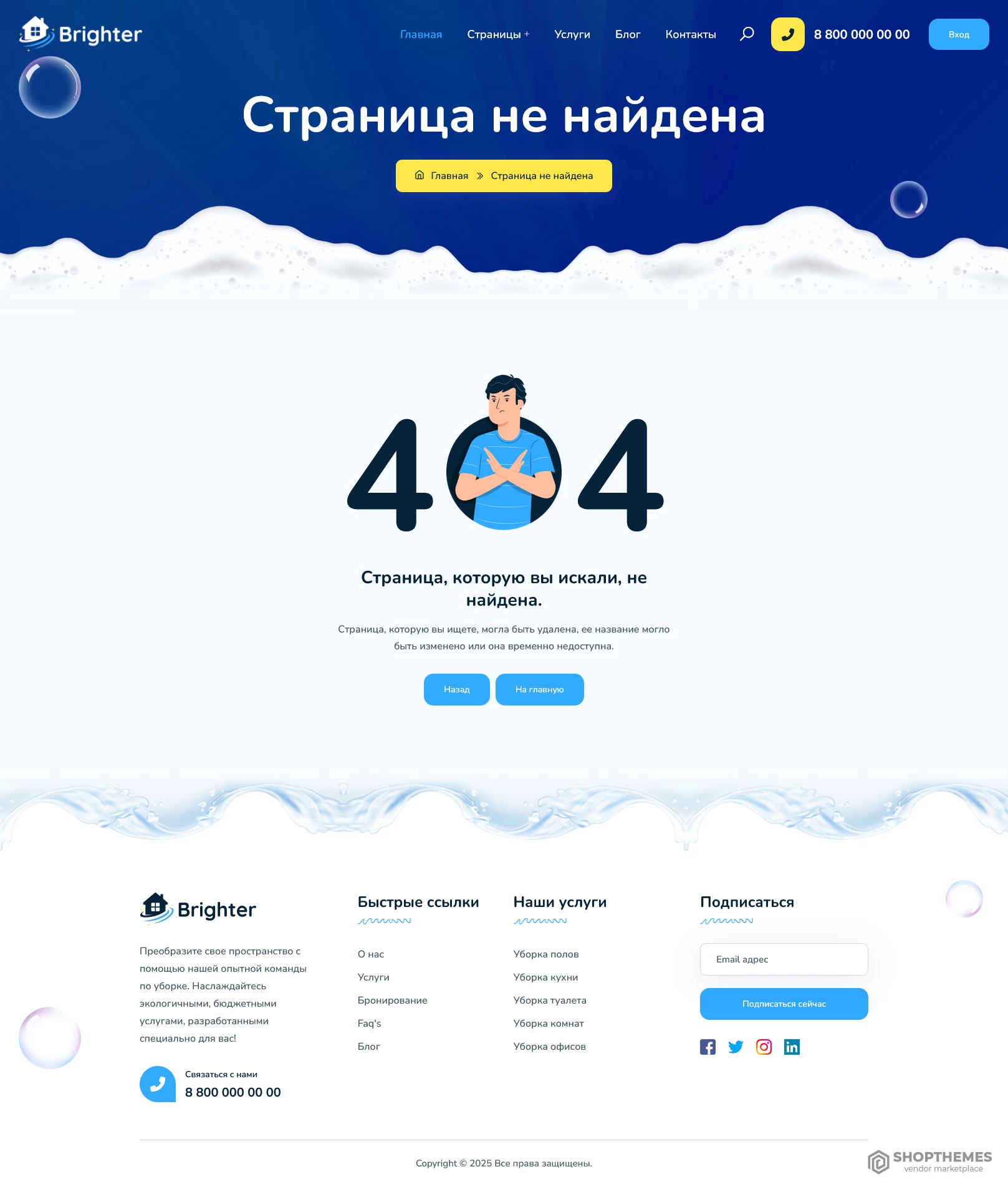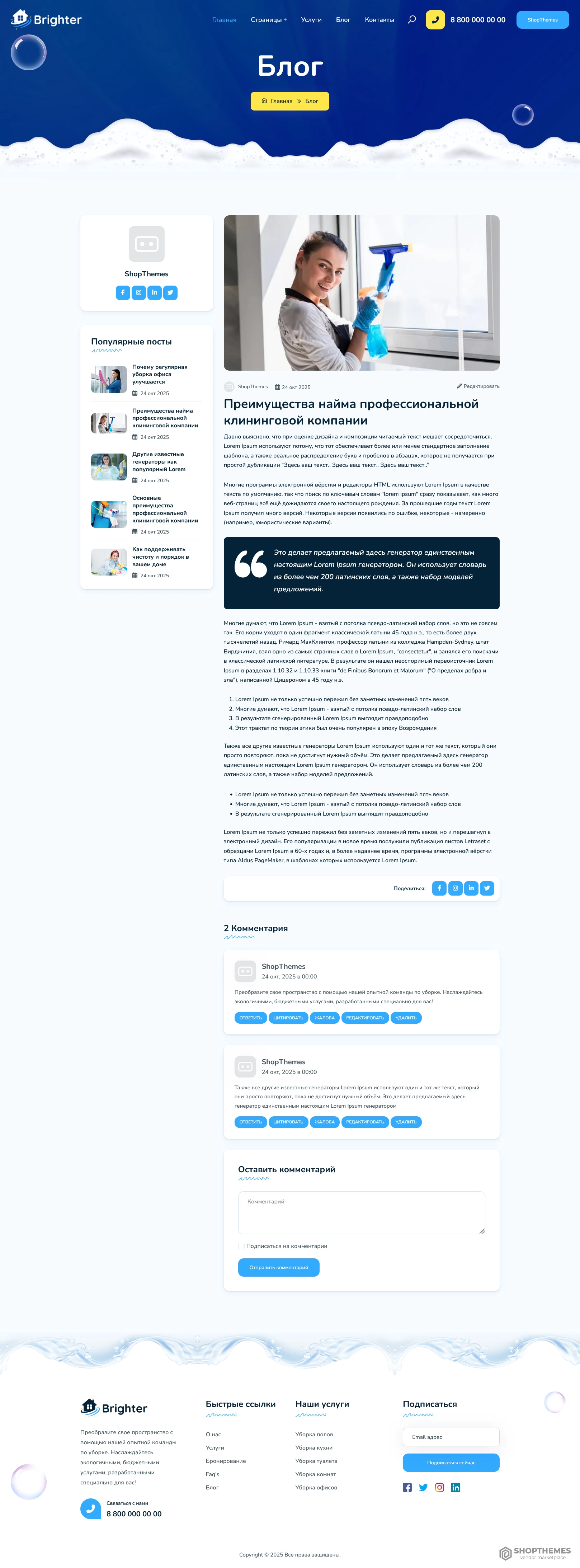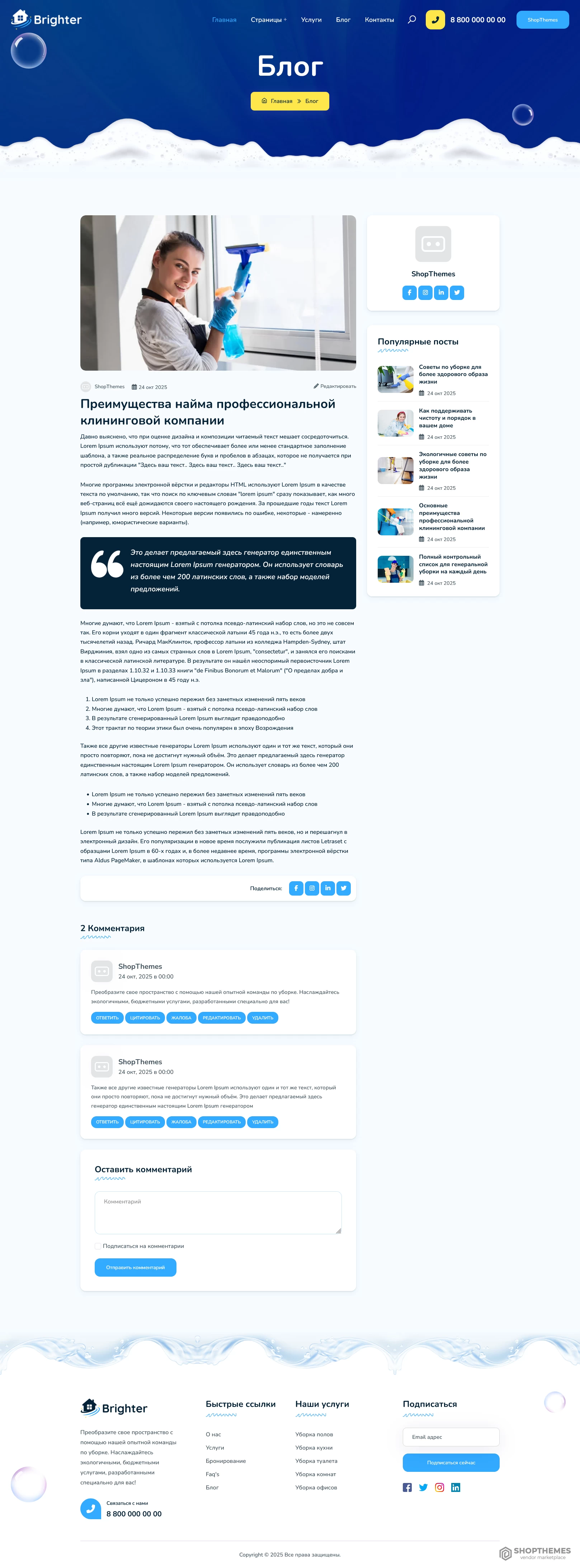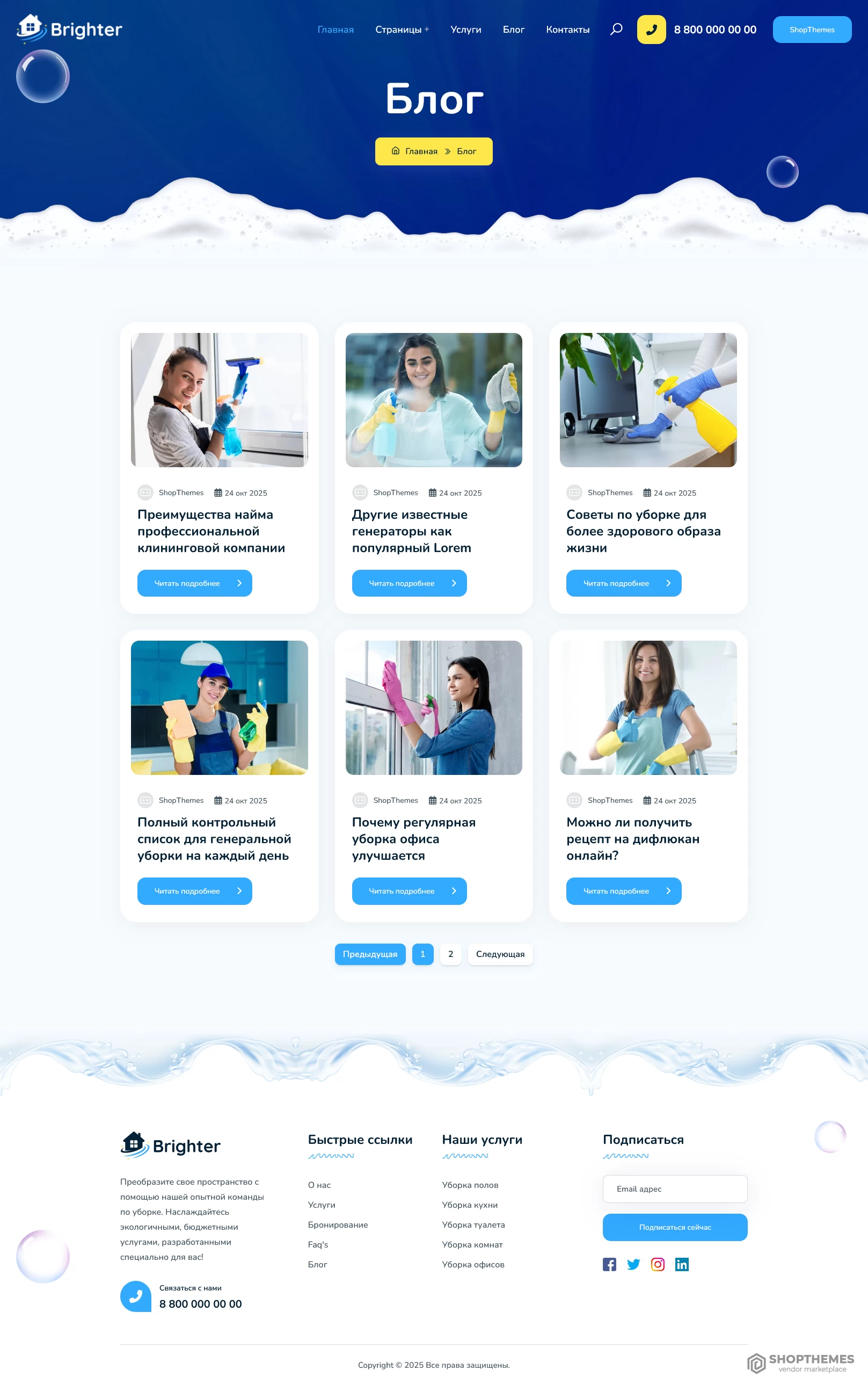 Brighter — это современный и полностью адаптивный шаблон DLE, разработанный для компаний, работающих в сфере клининга, технического обслуживания и услуг разнорабочих. Этот шаблон идеально подходит для клининговых компаний, электриков, инженеров, маляров, сантехников и поставщиков, обеспечивая простой и удобный интерфейс. Разработанный с использованием Bootstrap 5, HTML5, CSS3 и SASS, он обеспечивает высокую производительность, лаконичный дизайн и простую настройку.