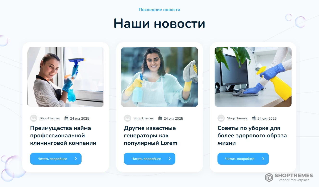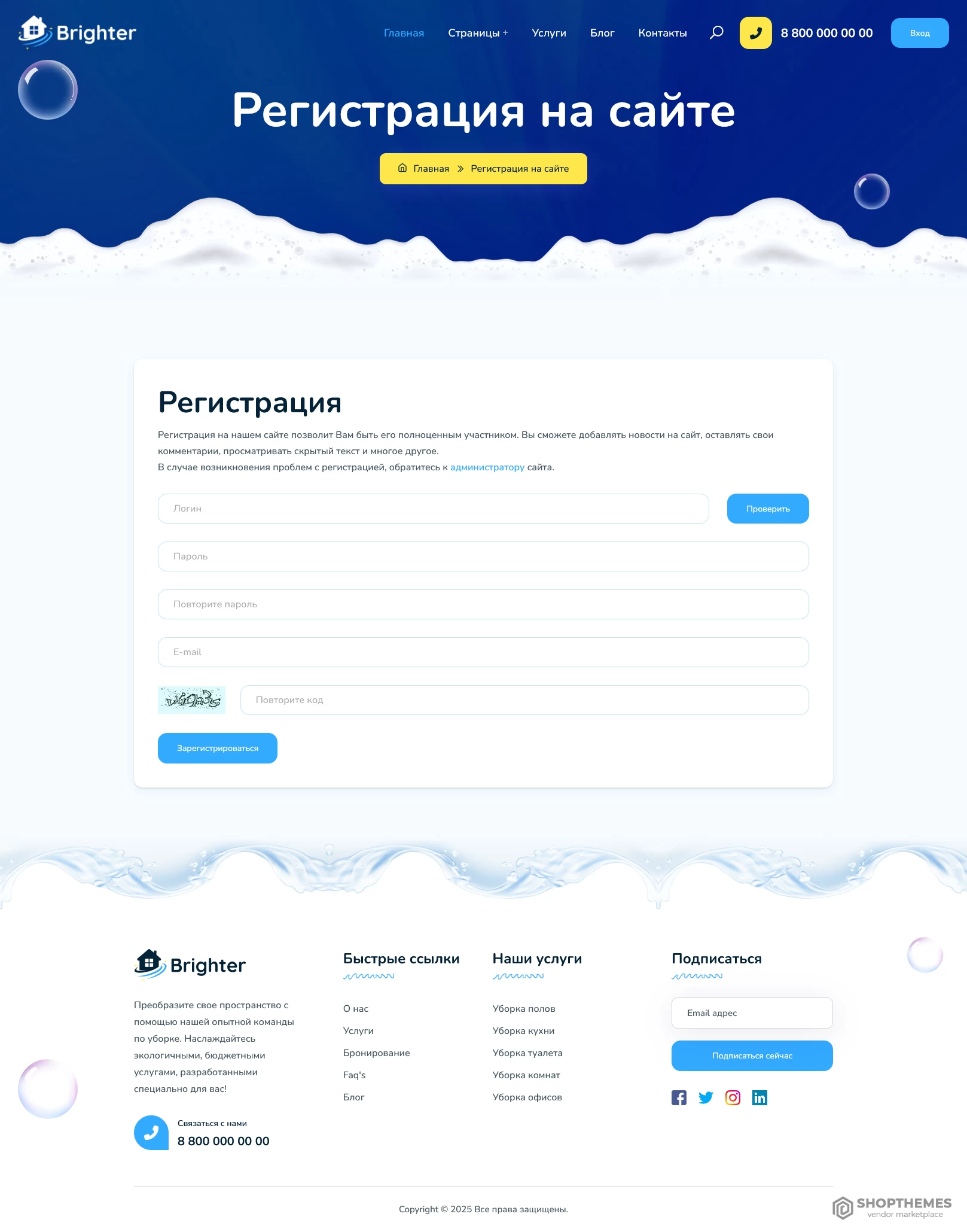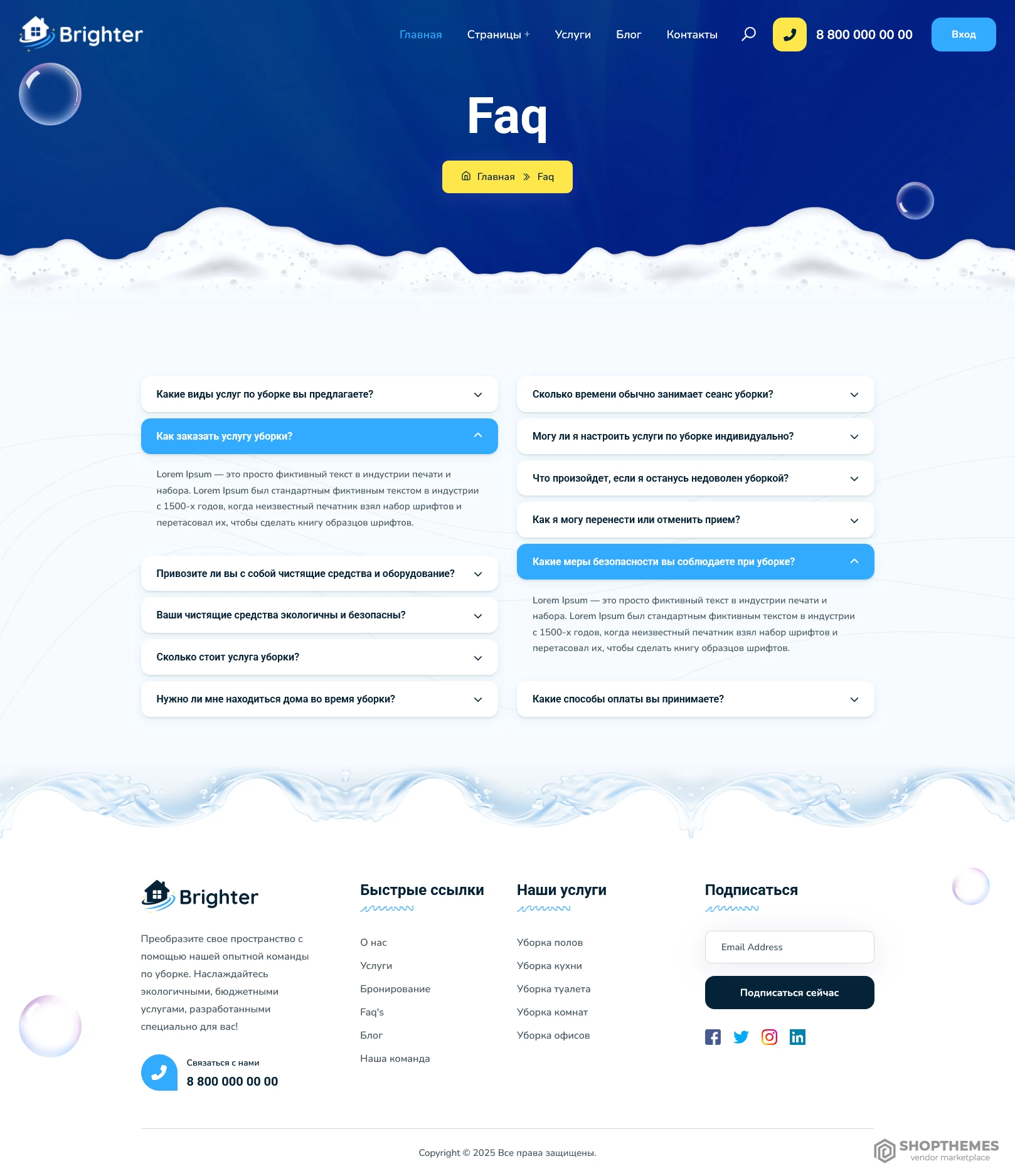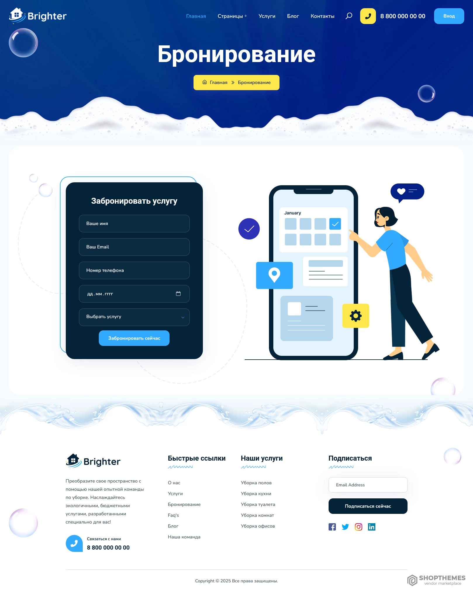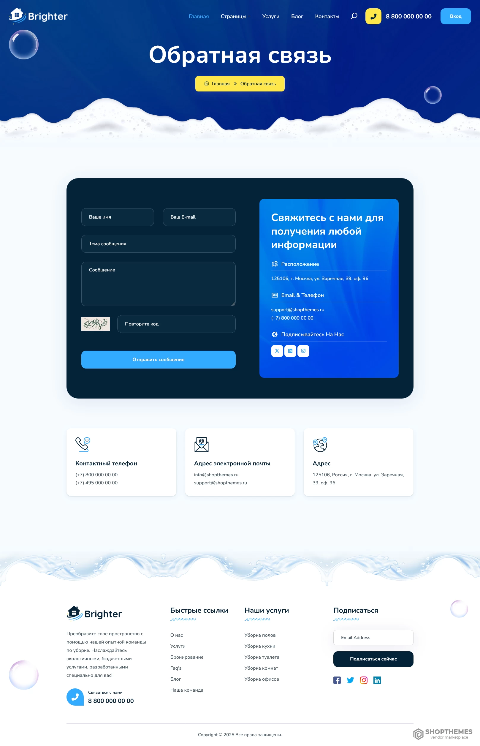 Brighter — это современный и полностью адаптивный шаблон DLE, разработанный для компаний, работающих в сфере клининга, технического обслуживания и услуг разнорабочих. Этот шаблон идеально подходит для клининговых компаний, электриков, инженеров, маляров, сантехников и поставщиков, обеспечивая простой и удобный интерфейс. Разработанный с использованием Bootstrap 5, HTML5, CSS3 и SASS, он обеспечивает высокую производительность, лаконичный дизайн и простую настройку.