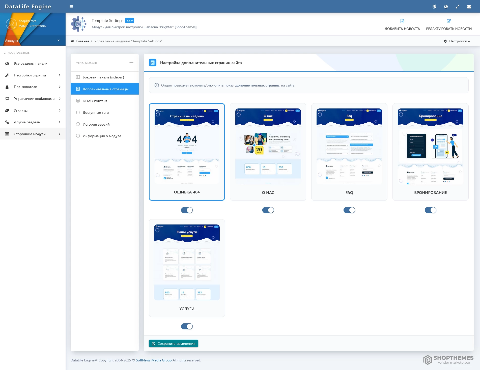- Дополнительные страницы: Благодаря возможностям модуля шаблона, вы сможете включить/отключить показ дополнительных страниц на сайте.