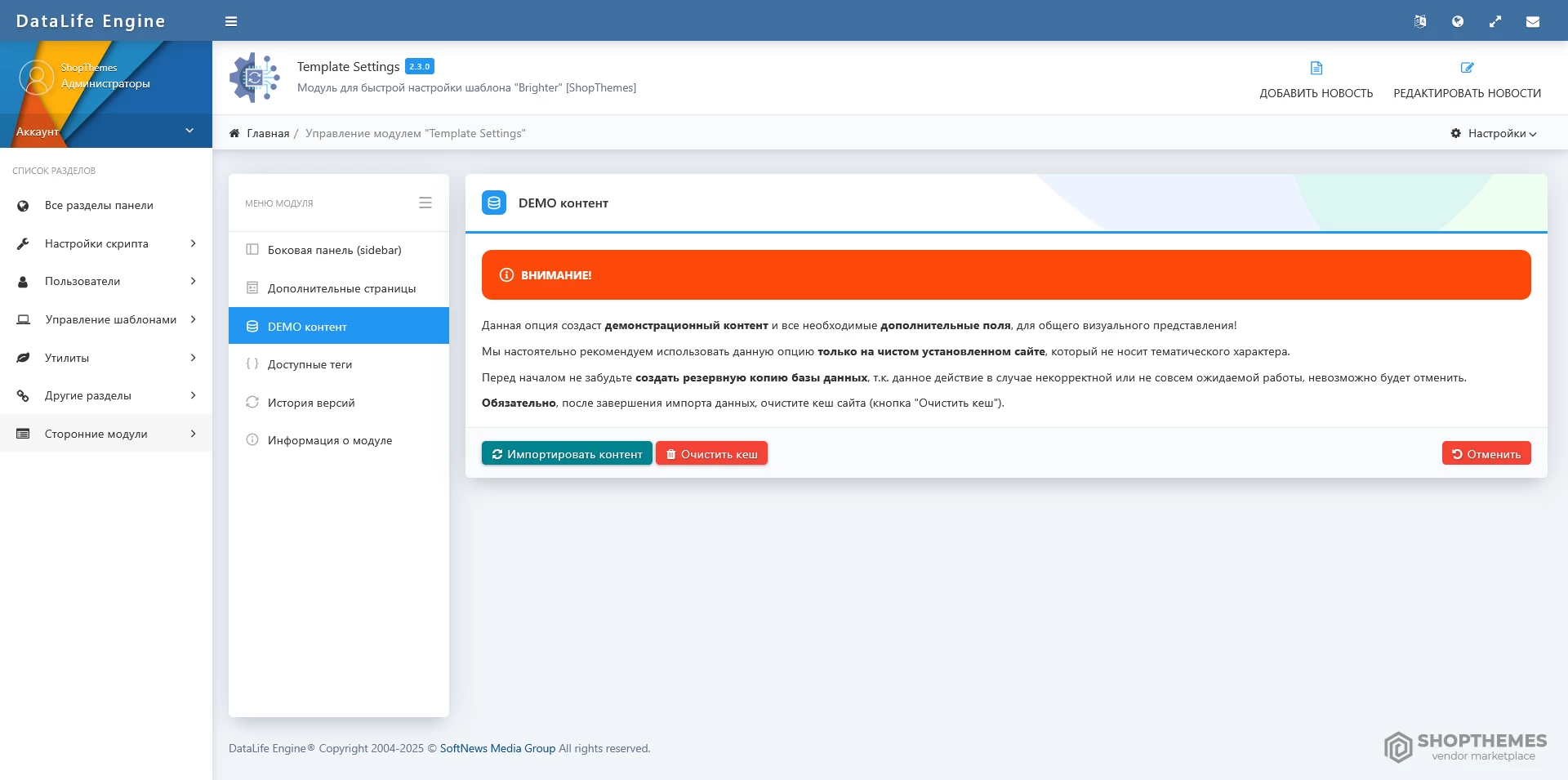 Данная опция, создаст демонстрационный контент и все необходимые дополнительные поля, для общего визуального представления! Все изображения на снимках экрана предназначены только для демонстрационных целей.