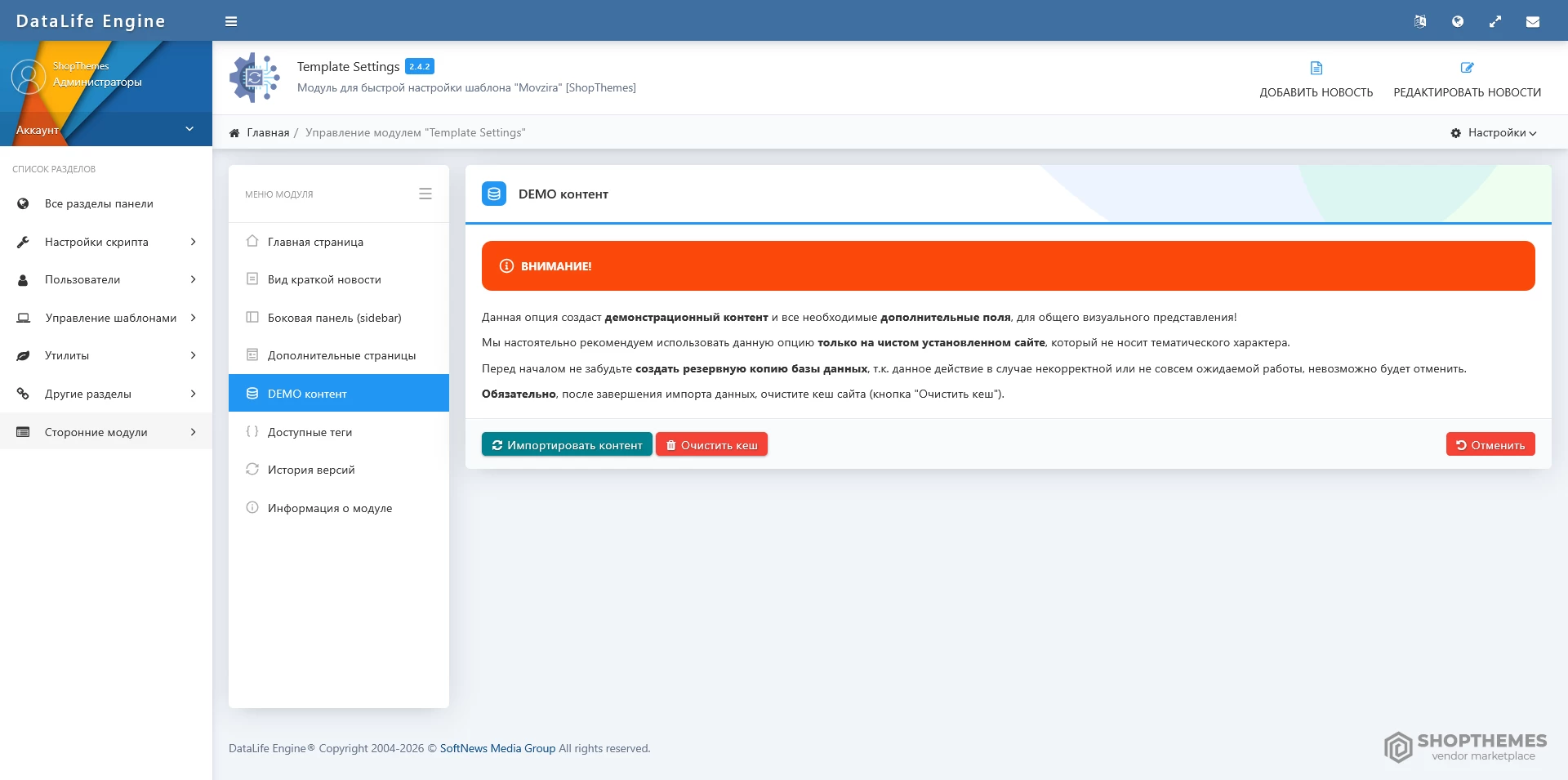 Вы можете импортировать демонстрационный контент в пару кликов. Данная опция, создаст демонстрационный контент и все необходимые дополнительные поля, для общего визуального представления!