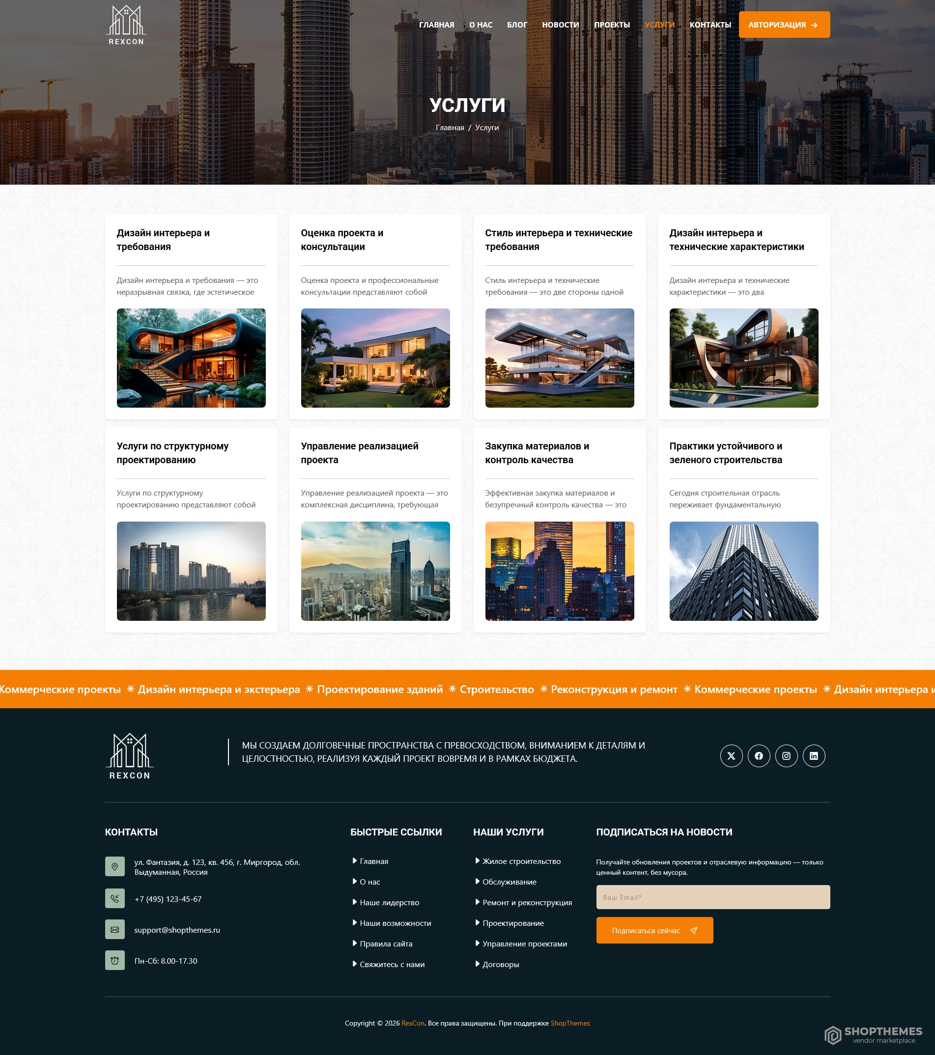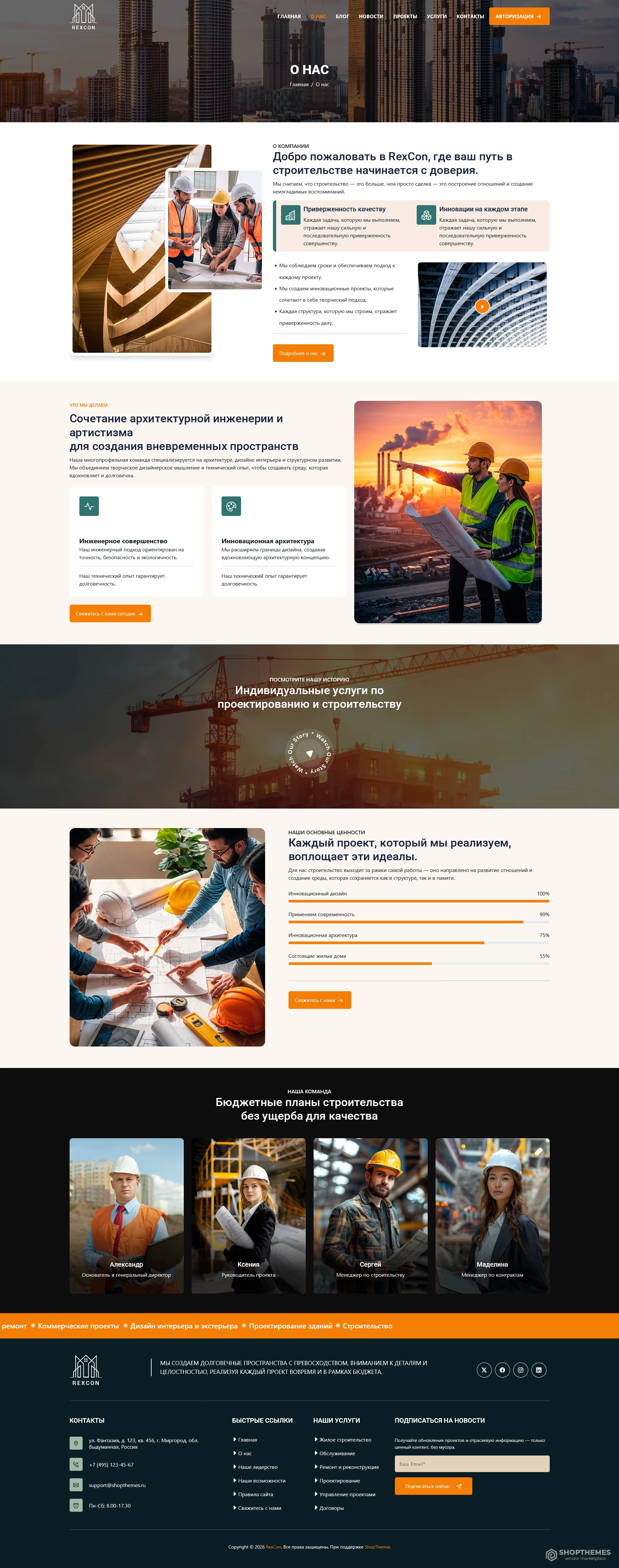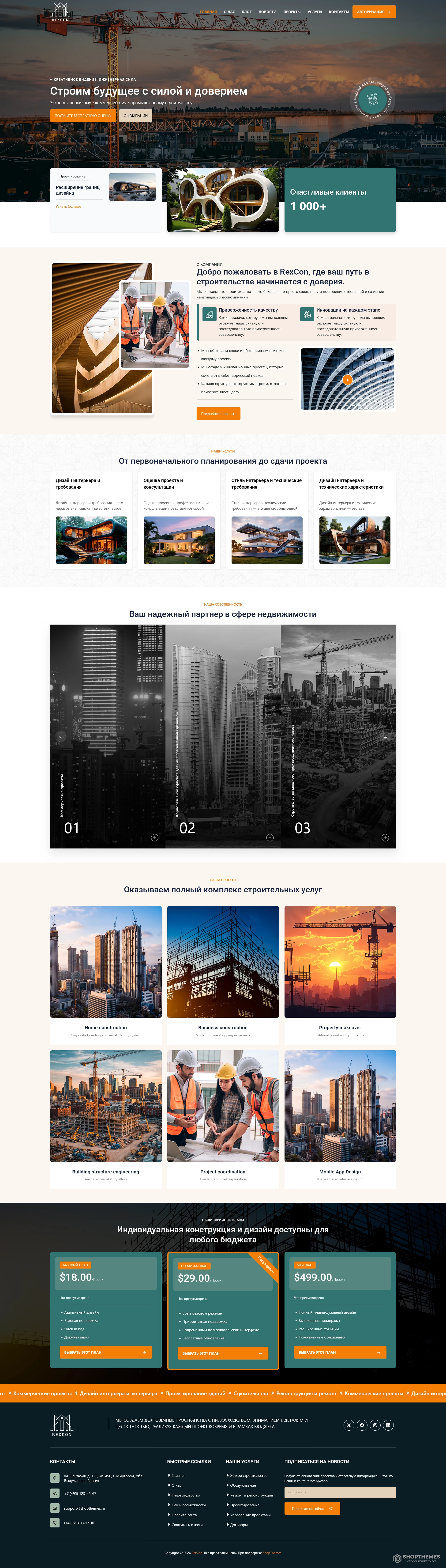 RexCon — современный профессиональный шаблон для DataLife Engine, разработанный под задачи строительного бизнеса, промышленных предприятий, архитектурных бюро, девелоперов и сервисов ремонта. Дизайн выдержан в эстетике индустриальной надёжности: чёткая сетка, акцент на проектах и услугах, визуальная иерархия, которая направляет внимание заказчика к ключевым блокам — портфолио объектов, контакты, форма заявки.