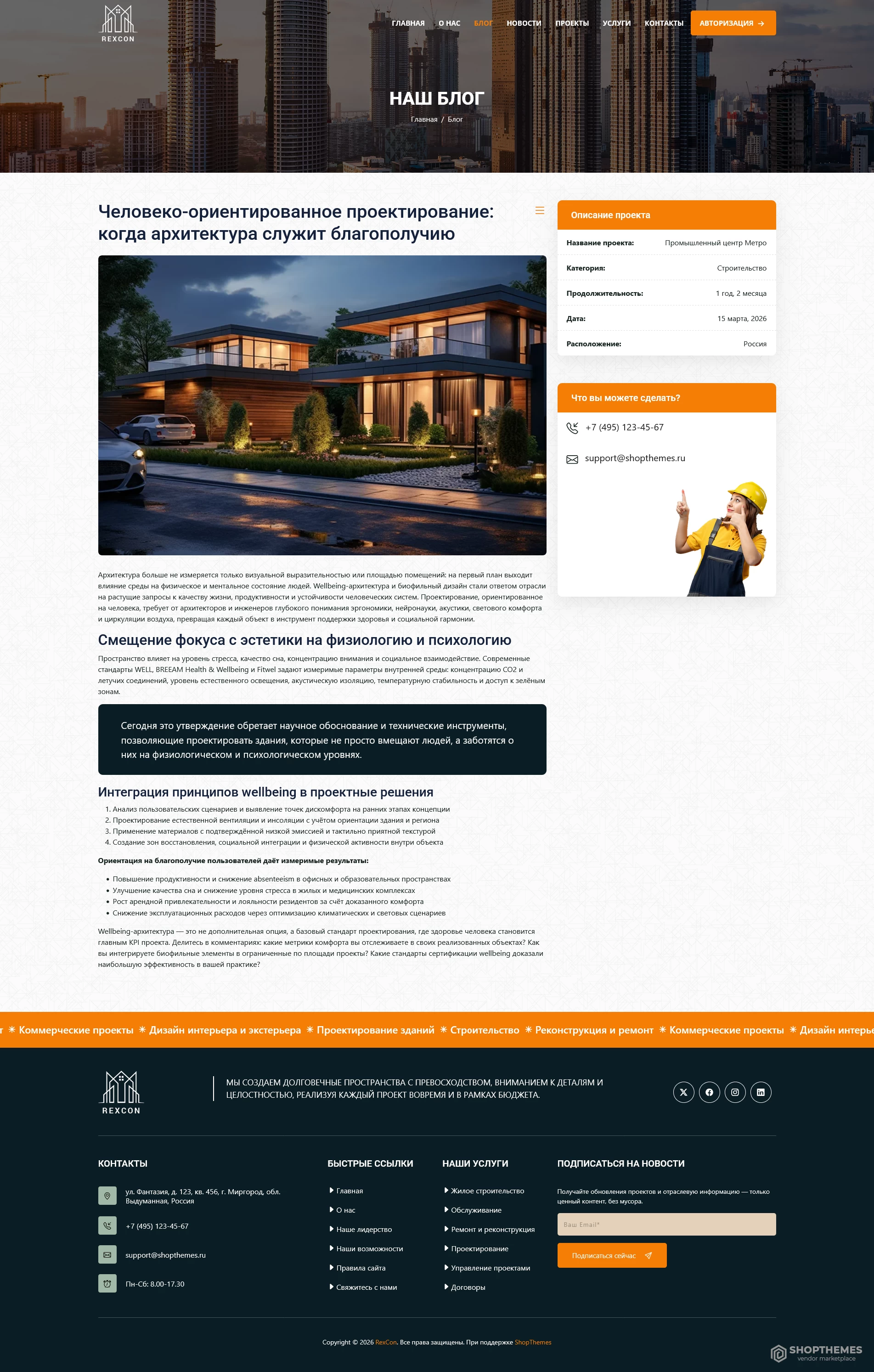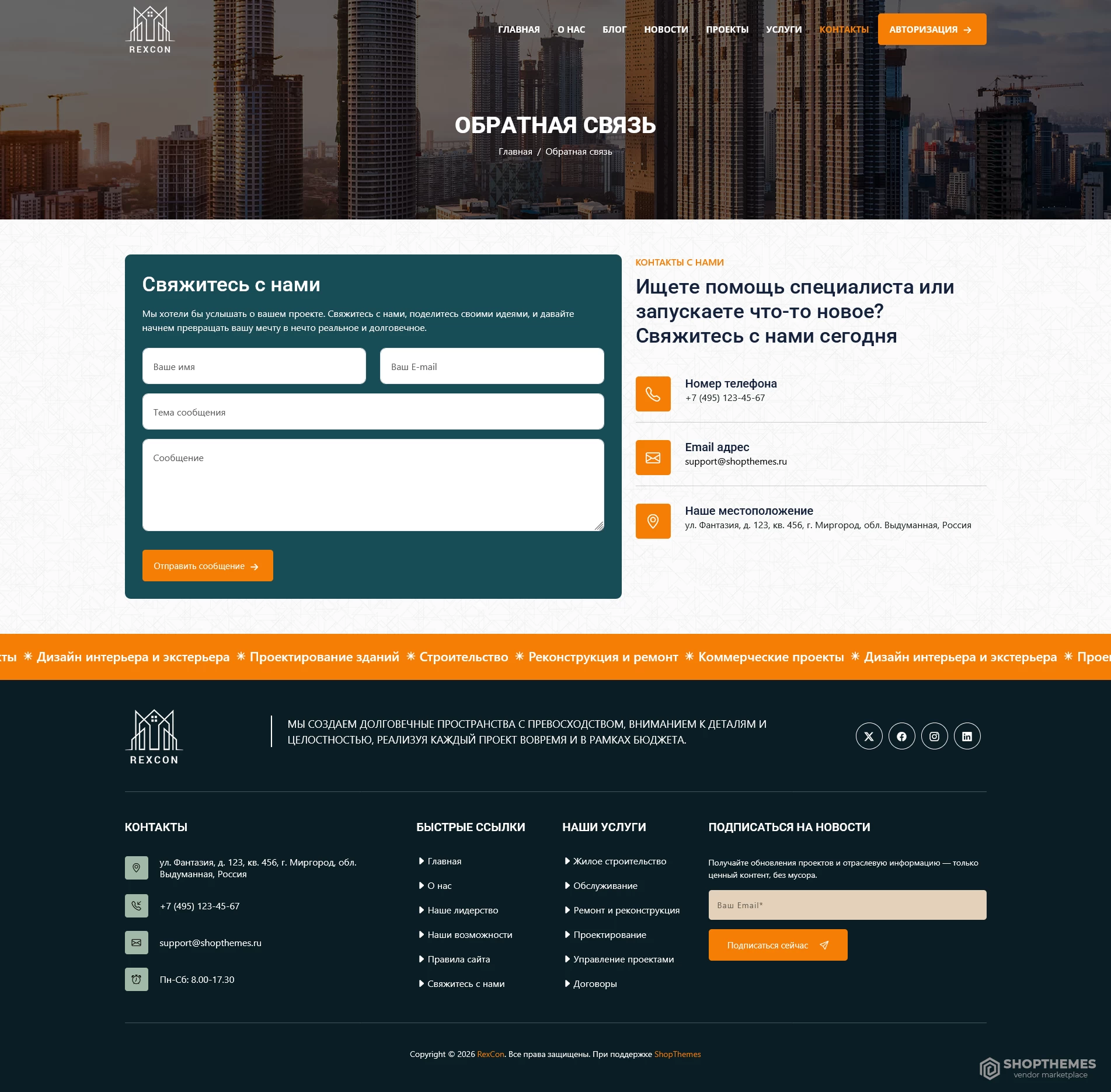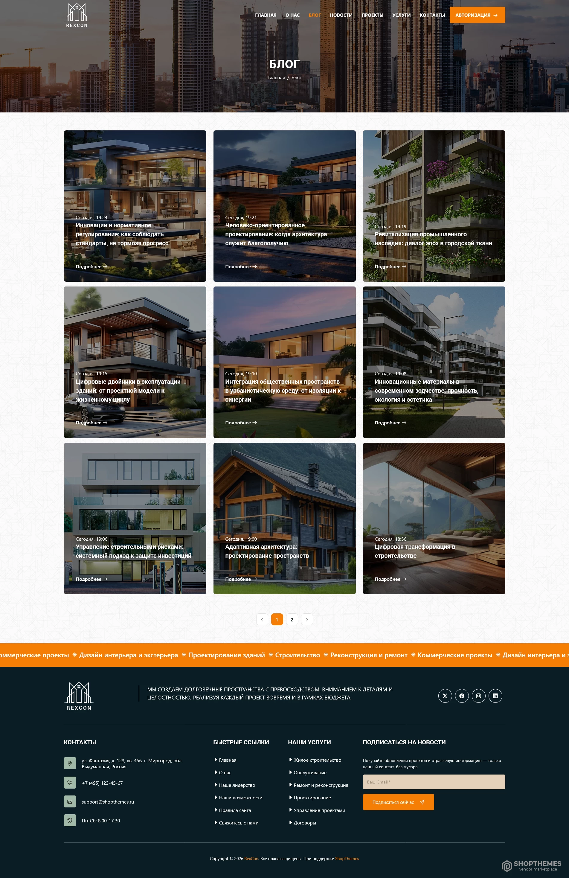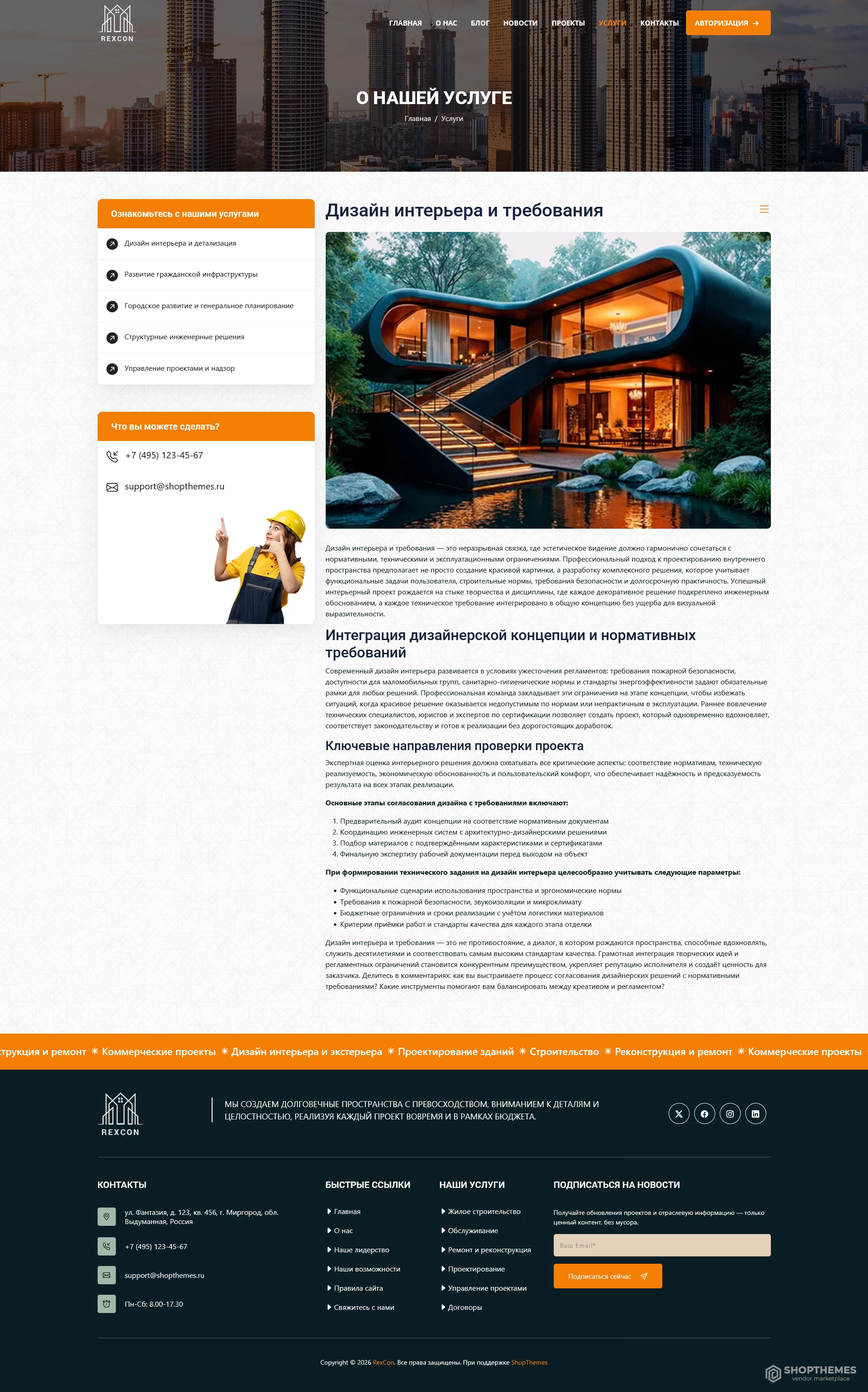 RexCon — современный профессиональный шаблон для DataLife Engine, разработанный под задачи строительного бизнеса, промышленных предприятий, архитектурных бюро, девелоперов и сервисов ремонта. Дизайн выдержан в эстетике индустриальной надёжности: чёткая сетка, акцент на проектах и услугах, визуальная иерархия, которая направляет внимание заказчика к ключевым блокам — портфолио объектов, контакты, форма заявки.